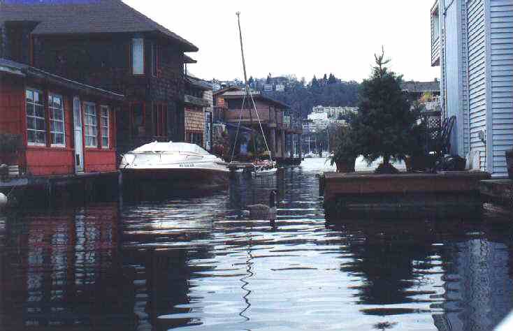 This is one of the aquatic alleys on Lake Union, between some of the houseboats moored along the shores. Sometimes it is a bit difficult to maneuver between the houses, boats and geese! However, the Escapade can pretty easily turn around in these tight spaces, and only requires a couple of feet for safe passage.