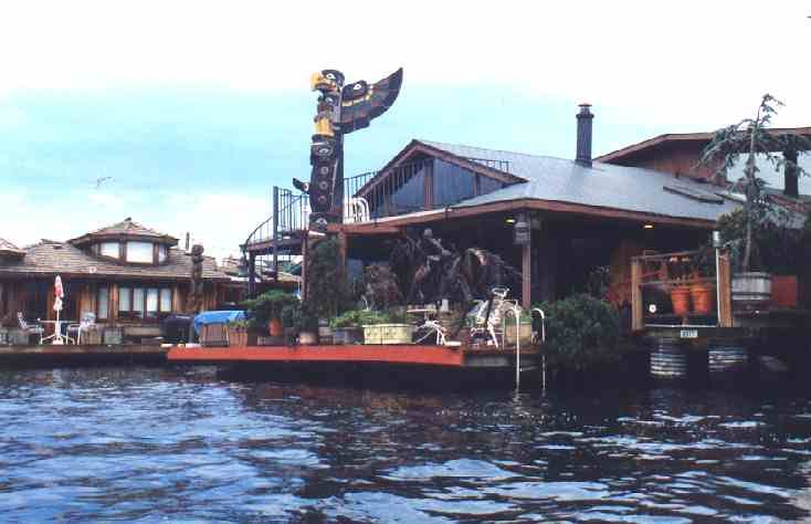 This houseboat has a lot of neat artwork, including an iron horse, authentic totem pole, and a great view of the lake.