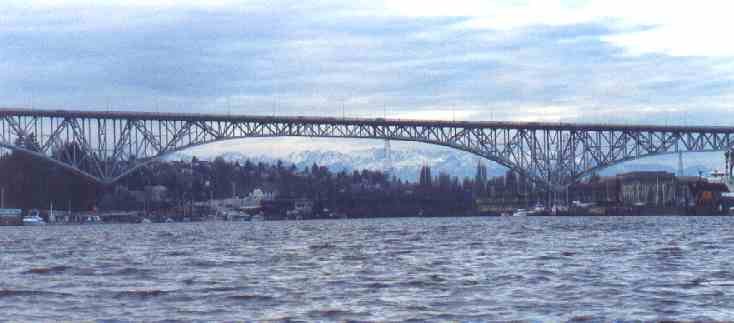 Here is a view of the Aurora Avenue bridge towards the Olympic Peninsula.. You can see the snow covered mountains off in the distance.