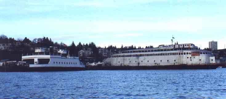 The above picture is of two out-of-service car ferries that used to ply the waters of Puget Sound. I forget the name of the small white one on the left, but the one on the right is the Kalakala. It is in the process of being refurbished, and it is in dire need of funding to complete the job.